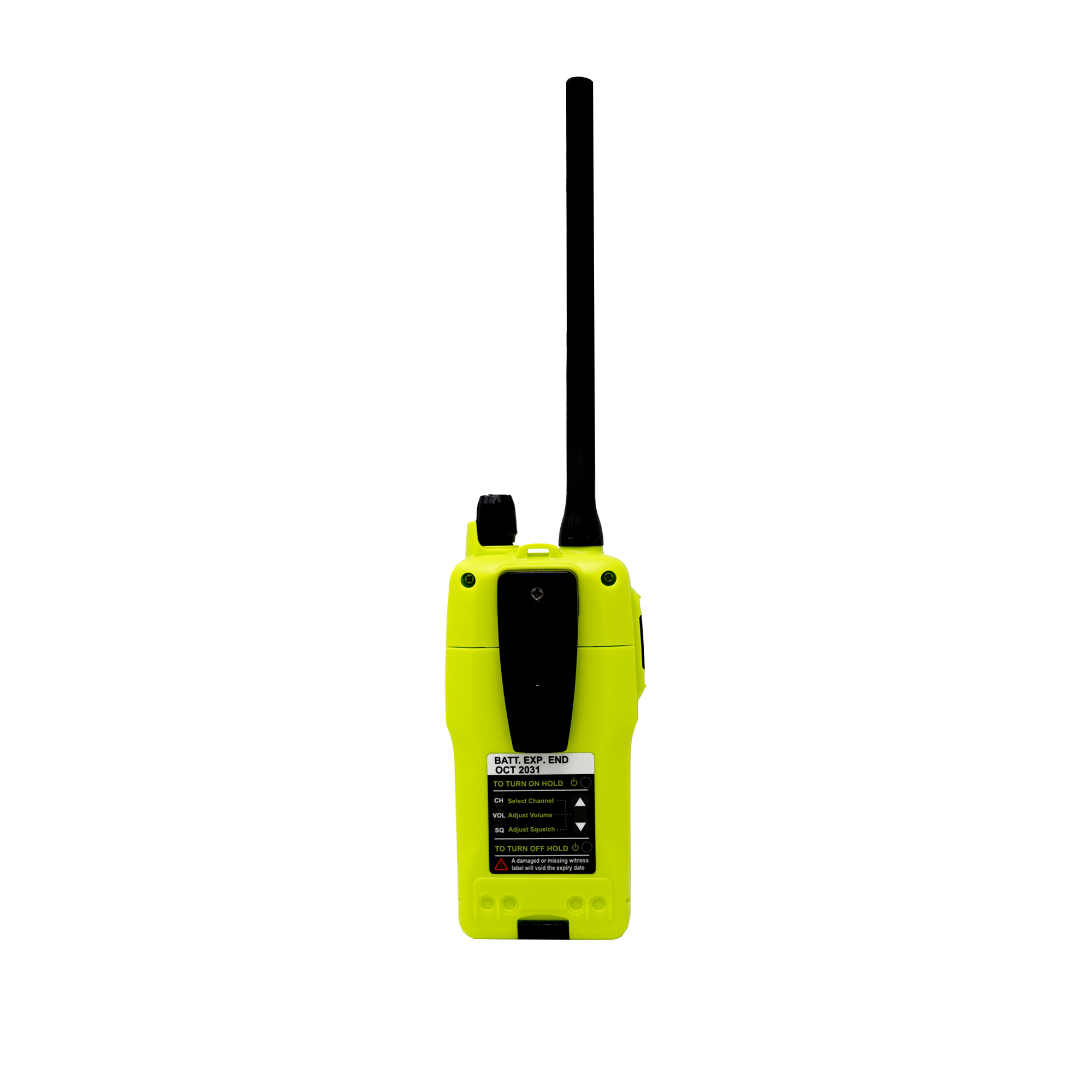The GMDSS Emergency VHF comes with a primary Lithium battery, which includes a battery witness label so that there is never any question as to whether the primary battery has been used or not. Once the witness label is removed, the radio will auto power on when the battery is connected, and the unit will also automatically enter GMDSS operation mode with the following preset settings, channel 16, volume level 8, and squelch set to 2.