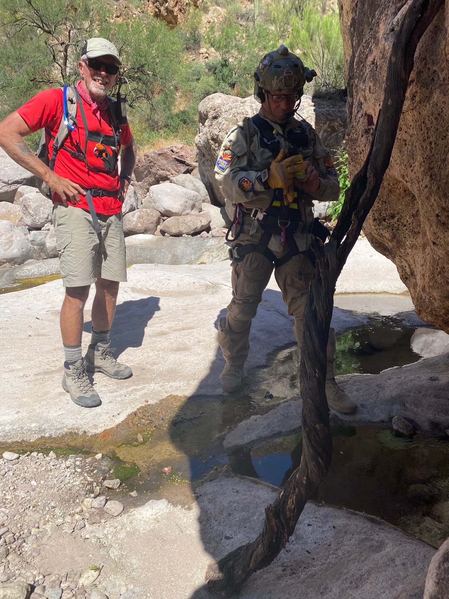 My friend and I were hiking in the Boulder Canyon area. We reached the summit of Battleship Mountain. From there we descended down into LaBarge Creek and started boulder hopping down the creek towards our exit. Marty stepped down on a loose boulder and it kicked his left foot out causing him to fall, breaking his ankle. With the amount of boulder hopping left, Marty was not able to navigate the creek bed. I activated my Sarlink PLB for assistance. The Highway Patrol SAR arrived and lifted Marty into their helicopter. The SAR people stated that the signal they received from my PLB was spot on and allowed them to reach us in a timely manner.
