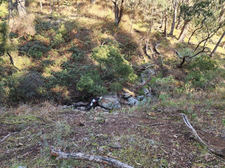 I started out Saturday around 10am and followed some tracks up in the forest near Tumut. After awhile, I ended up in an area that was quite steep and very unfamiliar. After a major clutch failure on my bike, I took some overgrown tracks but soon became disoriented and fatigued. Upon coming across a track, there was severe washout one way, and a large fallen tree in the other direction.