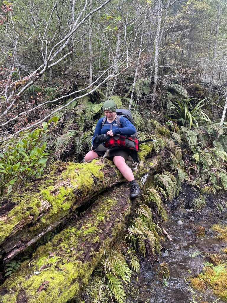 It was my birthday weekend, and I love swimming in cold water, especially since I live in New Zealand. My birthday falls in winter. To celebrate, my friend Cat and I planned a tramp to a lake—just a 6-hour walk to a hut with a nice swing bridge over a river. It seemed like a simple, enjoyable trip, with my little dog Flynn joining us.